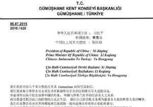 Gümüşhane Kent Konseyi, Doğu Türkistan’da Uygur Türklerine yapılan zulüm ve işkencenin durdurulması için hazırladığı Çince, İngilizce ve Türkçe mektubu Çin Devlet Başkanı Xi Jinping, Çin Başbakanı Li Keqiang ve Çin Ankara Büyükelçisi Yu Hongyang’a email ve faks olarak gönderdi.