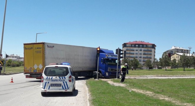 Sivas'ta meydana gelen trafik kazasında lastiği patlayan tır makaslama yaparak trafik lambasına çarptı. Kaza sonrası Sivas-Erzincan yolu bir süreliğine trafik kapandı.