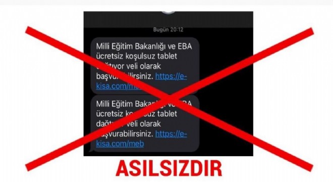 Milli Eğitim Bakanlığı, vatandaşları "Milli Eğitim Bakanlığı ve EBA ücretsiz, koşulsuz tablet dağıtıyor. Veli olarak başvuru için tıklayınız" şeklindeki sahte mesaj linklerine giriş yapmamaları konusunda uyardı.