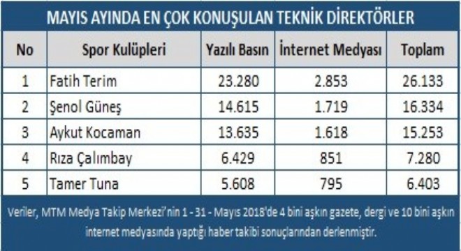 Galatasaray teknik direktörü Fatih Terim, yarım sezondur başında olduğu takımın şampiyon olmasıyla medyada gündemden düşmedi. Şampiyonluğun yanında çeşitli eleştirilerle de konuşulan Terim, takımının elde ettiği şampiyonluk ve yaptığı açıklamalarla 26 bin 133 haberle bu ay en çok konuşulan teknik direktörü oldu.