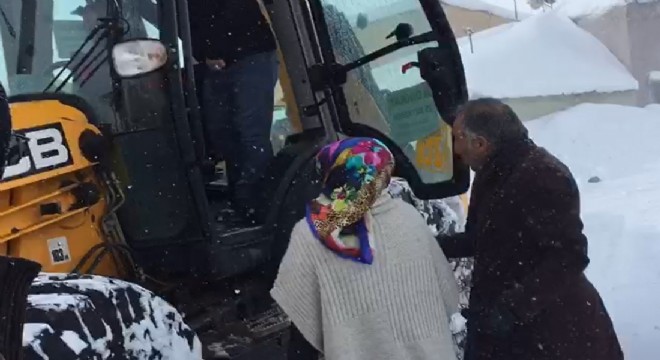 Bingöl'ün Karlıova ilçesinde kar ve tipi nedeniyle evine gidemeyip belediyeye sığınan hamile kadın, kepçe ile evine ulaştırıldı.