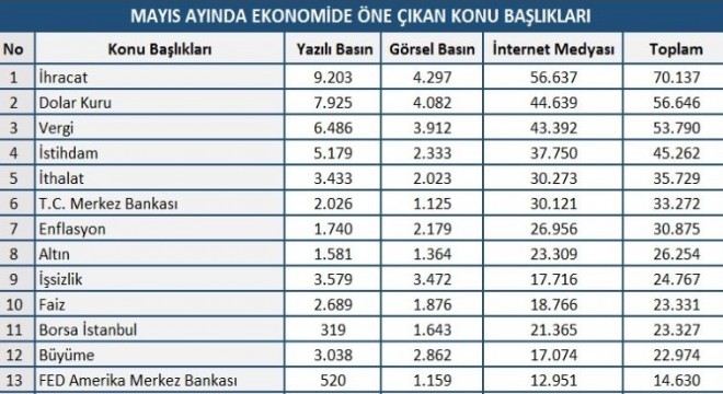 Türkiye İhracatçılar Meclisi (TİM) verilerine göre, Mayıs ayının ihracat şampiyonu ise otomotiv oldu. Otomotiv endüstrisi, geçen ay 1 milyar 202 milyon 942 bin dolarla en fazla ihracat gerçekleştirilen sektör oldu. Otomotiv endüstrisini ise 1 milyar 177 milyon 318 bin dolarla kimyevi maddeler ve mamülleri, 840 milyon 203 bin dolarla hazır giyim ve konfeksiyon takip etti. En fazla ihracat artışı ise yüzde 13,4 ile yaş meyve ve sebze sektöründe gerçekleşti. Mayıs ayı boyunca toplam 70 bin 137 haberde konuşulan ihracat ayın en çok konuşulan ekonomi başlığı oldu. İthalat ise 35 bin 729 haberde yer alarak listenin beşinci sırasında kendine yer buldu.