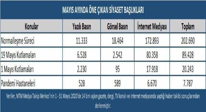 Medya Takip Merkezi'nin (MTM) yaptığı araştırmaya göre Türkiye, Mayıs ayında en çok koronavirüs önlemleri kapsamında gelişen Normalleşme Sürecine' odaklandı. Pandemi önlemleri nedeniyle bu yıl evlerde gerçekleştirilen 1 Mayıs ve 19 Mayıs kutlamaları da ay boyunca konuşulan konuların başında geldi.