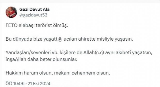 15 Temmuz Gazisi Tümgeneral Davut Alâ, Fetullahçı Terör Örgütü (FETÖ) elebaşı Fetullah Gülen’in ölümü nedeniyle yaptığı paylaşımda, “Hakkım haram olsun, mekanı 'cehennem' olsun” dedi.