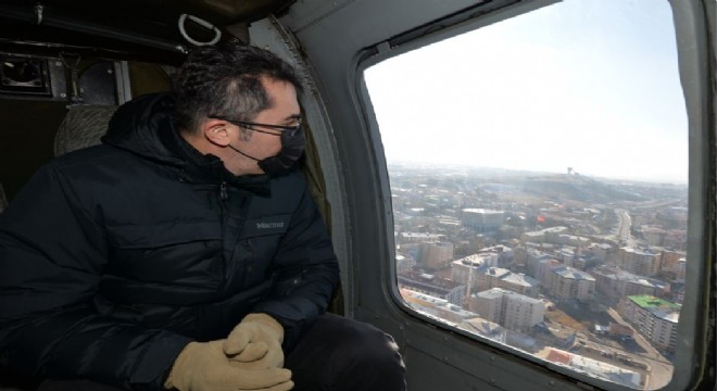 Erzurum Valisi Okay Memiş ve beraberindekiler sokağa çıkma kısıtlamasının ikinci gününde cadde, sokak ve mahalleleri helikopterle denetledi.