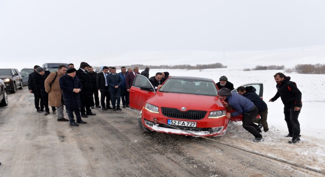 Vali Okay Memiş’i takip eden gazetecileri taşıyan otomobil buzlu yolda kayarak yoldan çıktı ve kara saplandı. Gazeteciler kazayı yara almadan atlatırken araç iş makinesi yardımıyla çekilerek kurtarıldı.