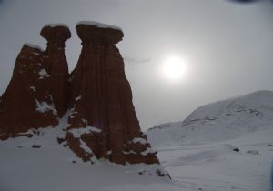 FATİH DÜZAVCI (İHA) - Erzurum’un Narman İlçesi’nde bulunan Peri Bacaları kar örtüsüyle birlikte adeta gelinliğini giydi. Narman ilçe merkezine 7 kilometre uzaklıkta bulunan kırmızı peri bacaları kar ile bütünleşince ortaya doyumsuz bir görüntü çıktı. Kırmızı ve beyazın farklı tonlarının yaşandığı bölge fotoğrafçılarında ilgi odağı haline geldi.