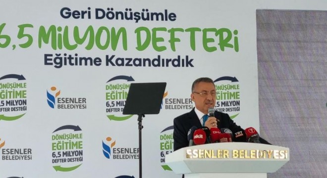 Cumhurbaşkanı Yardımcısı Fuat Oktay, Esenler’de geri dönüşümden eğitime kazandırılan defterlerin öğrencilere dağıtıldığı defter dağıtım törenine katıldı. Tacirler Eğitim Vakfı İlkokulu’nda gerçekleştirilen törene Cumhurbaşkanı Yardımcısı Fuat Oktay’ın yanı sıra İstanbul Valisi Ali Yerlikaya, Esenler Belediye Başkanı Mehmet Tevfik Göksu, öğretmenler, veliler ve öğrenciler katıldı. Öğrencilerin yaptığı resimlerin yer aldığı sergiyi gezen Oktay, törende bir konuşma yaptı.
