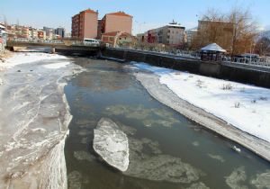 Son yılların en soğuk kış günlerini yaşayan Erzurum'da Oltu ilçe merkezinden geçen Oltu Çayı adeta buz akıyor.
