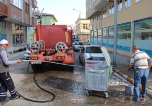 Erzurum Büyükşehir Oltu İtfaiye ekipleri ve temizlik ekipleri tarafından deterjanlı su ile yıkanıp tazyikli su ile çöp konteynerlerini titizlikle temizleyen ekipler, Belediye Başkanının talimatı ile ilçe merkezinde bulunan bütün çöp bidonlarını tek tek yıkayacaklarını söyledi.