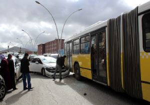 Erzurum şehir merkezinde park halindeki otomobil seyir halindeki halk otobüsüne çarpınca trafik kilitlendi.