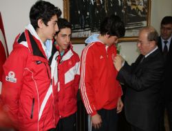 Vali Öztürk konuşmasının sonunda sporcuları tebrik ederek çeyrek altın taktı.