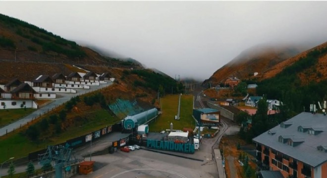 Drone ile havadan görüntülenen Palandöken Kayak Merkezinde yağmur devam ederken görüş mesafesinin ise 10 metreye kadar düştüğü göründü.