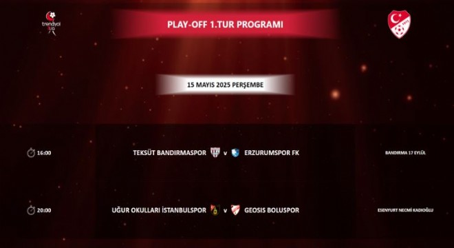 TFF Kurumsal Web sitesinden yapılan açıklamada Play-Off 1’inci tur maçları programı açıklandı. Buna Före Erzurumspor 15 Mayıs Perşembe günü saat 16:00’da Bandırmada Bandırmaspor karşısında tur mücadelesi verecek.