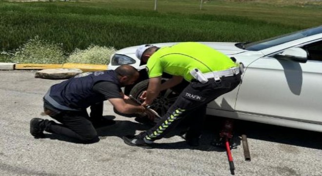 Uygulama esnasında lastiğinin patlak olduğu görülen bir vatandaşın otomobil lastiği ilçe emniyet müdürlüğü ekipleri tarafından değiştirilerek yolculuğuna devam etmesi sağlandı.