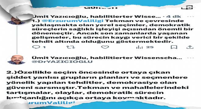 Tekman’da yapılacak seçimlerle ilgili terörize bir takım faaliyetlerinin olduğunu, şiddet yanlısı grupların seçmen eğilimlerini etkilemek için çaba sarf ettiklerini sosyal medya kanalıyla duyuran Yazıcıoğlu, Erzurum Valiliğini de etiketleyerek çok duyarlı bir davranışın altına imza attı.