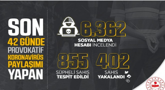 İçişleri Bakanlığı sosyal medya hesabı üzerinden yaptığı paylaşımda korona virüs salgını çerçevesinde asılsız ve provokatif paylaşım yapan 402 kişinin yakalandığını bildirdi. Bakanlık paylaşımında, “ Sosyal medyada son 42 günde, asılsız ve provokatif Korona virüs paylaşımları yapan; 6 bin 362 sosyal medya hesabı incelendi, 855 şüpheli şahıs tespit edildi, 402 şahıs yakalandı” notu düşüldü.