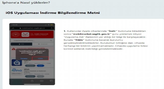 “1. Kullanıcılar Apple cihazlarında ‘İndir’ butonuna tıkladıktan sonra; ‘mobilmarket.saglik.gov.tr’ şunu yüklemek istiyor: ‘Uygulama Adı’ ifadesinin yer aldığı bir bilgi ile karşılaşacaktır. Burada ‘Yükle’ butonuna basarak kurulumu gerçekleştirebilmektedirler. Kurulumun bittiğine dair, cihazda herhangi bir bildirim yapılmamaktadır. Cihazda uygulama listesi kontrol edilerek indirildiği görülebilmektedir.