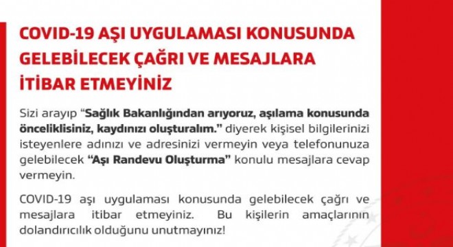“Sizi arayıp ‘Sağlık Bakanlığından arıyoruz, aşılama konusunda önceliklisiniz, kaydınızı oluşturalım’ diyerek kişisel bilgilerinizi isteyenlere; adınızı ve adresinizi vermeyin veya telefonunuza gelebilecek ‘Aşı Randevu Oluşturma’ konulu mesajlara cevap vermeyin. Covid-19 aşı uygulaması konusunda gelebilecek çağrı ve mesajlara itibar etmeyiniz. Bu kişilerin amaçlarının dolandırıcılık olduğunu unutmayınız! Covid-19 aşı uygulaması ile ilgili güncel ve güvenilir bilgiye T.C. Sağlık Bakanlığı internet siteleri ile sosyal medya hesaplarını takip ederek veya size en yakın sağlık kuruluşuna danışarak ulaşabilirsiniz.”