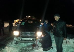 Yerel seçimler için görevli oldukları köylere gitmek üzere yola çıkan görevliler Aşkale’nin Dereköy istikametinde kar ve tipi yüzünden yolda kaldılar.