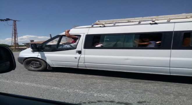 Ağrı-Erzurum şehirler arası yolda bir minibüste yolculuk yapan yaklaşık 20 kişi adeta kazaya davetiye çıkardı. Özellikle minibüsün şoför mahallinde oturan 5 yolcudan birinin, vücudunun yarısını dışarıya çıkartarak minibüsün tavanından tutunarak yolculuk yapması korkuttu.