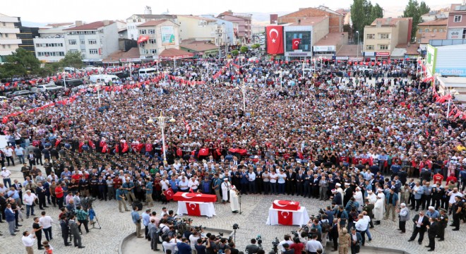 Hakkari'nin Yüksekova ilçesinde aracıyla seyir halindeyken PKK'lı teröristlerin önceden yerleştirdiği el yapımı patlayıcının infilak etmesi sonucu meydana gelen saldırıda şehit olan asker eşi Nurcan Karakaya ve oğlu Mustafa Bedirhan gözyaşları içerisinde memleketi Sivas'ın Şarkışla ilçesinde toprağa verildi.