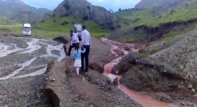 Oltu’ya bağlı Bahçeli kışla mahallesi Çeperli kışla sokakta sel suları yolları tahrip etti, araçlar mahsur kaldı.