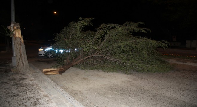 Erzincan'da etkili olan şiddetli rüzgar ve sağanak yağış ağaçları yerinden sökerek devirdi.