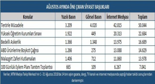 Medya Takip Merkezi (MTM), Ağustos ayında gündemde yer alan siyasi ve toplumsal başlıkları araştırdı. Yapılan inceleme, Ağustos ayında medyanın gündemini belirleyen ana başlığın terörle mücadele olduğunu ortaya koydu.