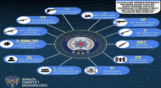 Bingöl İl Emniyet Müdürlüğü, asayiş şube ekiplerinin şüphe üzerine yaptığı çalışmalar ve mahalle bazlı şok uygulamalarda ele geçirilen malzemeleri açıkladı. 11 şüpheli şahsın tutuklandığı belirtilen açıklamada, “Asayiş Şube Müdürlüğünce meydana gelen olaylar, şüphe üzerine yapılan çalışmalar ve mahalle bazlı şok uygulamalarda 76 adet ruhsatsız tabanca, 77 adet uzun namlulu tüfek, 1 adet uzun namlulu AK-47 tüfek, 5 adet hap, 12 adet kurusıkı tabanca, 3 adet pompalı tüfek, 587 adet fişek ele geçirildi. Bu çalışmalarda 29 şüpheli şahıs yakalanırken 11 şüpheli şahıs da tutuklandı” denildi.