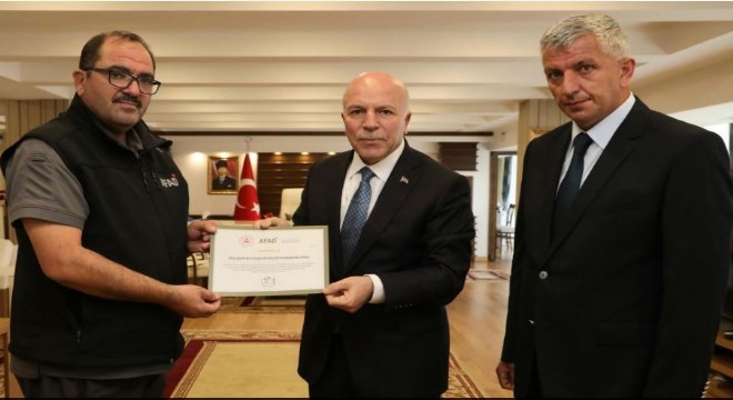 İçişleri Bakanı Süleyman Soylu, Erzurum Büyükşehir Belediyesi’ne teşekkür belgesi gönderdi. Batı Karadeniz’de yaşanan sel afetinde gösterdiği fedakârca çalışmalardan ötürü takdir gören Erzurum Büyükşehir Belediyesi ve Başkan Mehmet Sekmen’i tebrik eden Bakan Soylu’nun kaleme aldığı teşekkür belgesini AFAD Erzurum İl Müdürü Selahattin Karslı, Erzurum Büyükşehir Belediye Başkanı Mehmet Sekmen’e takdim etti.