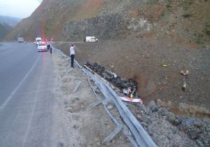Erzincan’da cam yapımında kullanılan silikat taşıyan TIR, uçuruma yuvarlandı. Kazada TIR sürücüsü hayatını kaybetti.