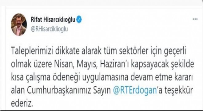 TOBB Başkanı Rifat Hisarcıklıoğlu, kısa çalışma ödeneğinin uzatılmasına ilişkin sosyal medya hesabından yaptığı paylaşımda, "Taleplerimizi dikkate alarak tüm sektörler için geçerli olmak üzere nisan, mayıs, haziranı kapsayacak şekilde kısa çalışma ödeneği uygulamasına devam etme kararı alan Cumhurbaşkanı Recep Tayyip Erdoğan’a teşekkür ederiz" ifadelerini kullandı.