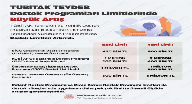 Sanayi ve Teknoloji Bakanı Mehmet Fatih Kacır, TÜBİTAK Teknoloji ve Yenilik Destek Programları Başkanlığı (TEYDEB) tarafından yürütülen destek programları üst limitlerinin artırıldığını açıkladı.