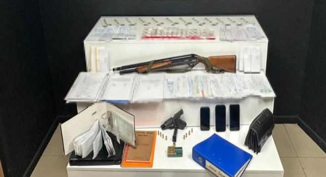 Şüphelilerin ikamet ve üzerlerinde yapılan aramalarda 1 adet ruhsatsız tabanca, 1 adet ruhsatsız av tüfeği, 38 adet fişek, 1 adet laptop, 1 adet bilgisayar kasası, borçlu şahıslara ait bilgilerin yer aldığı 2 adet ajanda ve alacak-verecek listeleri, borçlu şahıslara ait rehin evrakları, tapu evrakları, satış sözleşmeleri ile çok sayıda çek, çek koçanı ve senet ele geçirildi.