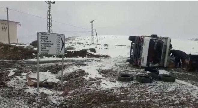 Tekman ilçesinde meydana gelen trafik kazasında karlı yanda kayan kamyonet yan yattı. Kazada sürücü hafif şekilde yaralandı.