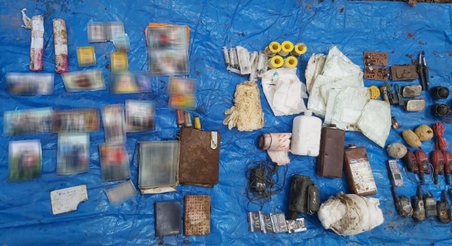 Açıklamada, “1 adet RPG-7 Roketatar, 1 adet Anti Tank Mühimmatı, 29 adet 7,62 mm. çapında AK-47 P.Tf. Fişeği, 1 adet AK-47 P.Tf. Şarjörü, 3 adet EYP Düzeneği, 2 adet EYP Devresi, 30 metre mablo , çok sayıda EYP yapımında kullanılan devre tamamlayıcı, 8 adet el telsizi, 1 üdet akü, 1 adet el t kamerası, 4 adet video kaset, 1 adet cep telefonu, 3 adet Solüsyon, 40 adet enjektör, 30 adet tampon, 5 adet plaster, 2 adet lehim makinesi, 2 adet siren, 1 adet el feneri, Sözde Eyalet Sicil Defteri, 1 adet fotoğraf Albümü, 2 adet eğitim notu, 1 adet günlük, 2 adet örgüt kimliği, 20 adet kıyafet, 6 adet büyük tüpq, 2 adet mutfak tüpü , 15 Adet piknik tüpü, 3 adet uyku tulumu, çok sayıda pil ile çeşitli kıyafetler ele geçirilmiştir” denildi.