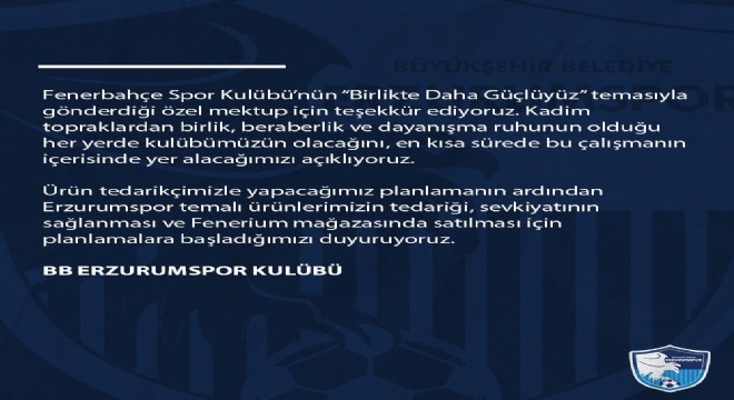Fenerbahçe’nin,  ‘Birlikte Daha Güçlüyüz’ temasıyla başlattığı kampanya çerçevesinde Erzurumspor spor ürünlerinin Fenerium’da taraftarlara sunulması davetine Erzurumspor yönetimi teşekkürle karşılık verdi.