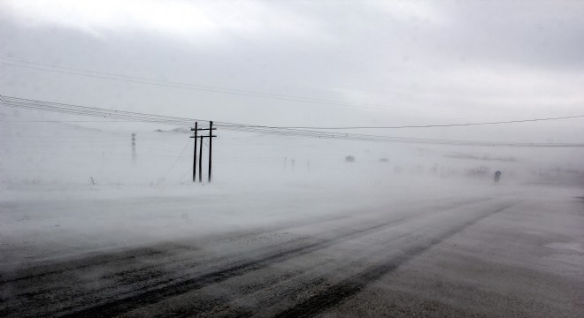 Erzurum’da hızı saatte 60 kilometreyi bulan fırtına kar tipisine dönüştü. Fırtına nedeniyle arazideki karlar savrularak sürgün oluştu.