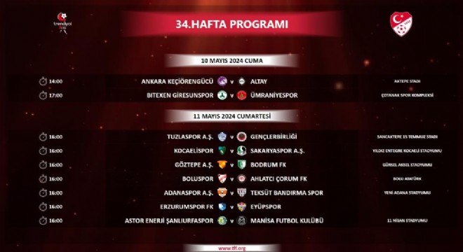Türkiye Futbol Federasyonu'nun (TFF) resmi internet sitesinden yapılan açıklamada, 1. Lig’in son haftasında oynanacak müsabakaların günleri belli oldu. 10-11 Mayıs tarihleri arasında yapılacak karşılaşmaların programı şöyle: