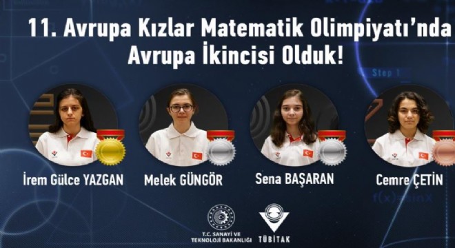 11’incisi düzenlenen ‘Avrupa Kızlar Matematik Olimpiyatı’nda TÜBİTAK Bilim İnsanı Destek Programları Başkanlığı (BİDEB) tarafından ‘2202 Bilim Olimpiyatları Programı’ kapsamında desteklenen Türk öğrenciler İrem Gülce Yazgan; Altın Madalya, Melek Güngör ve Sena Başaran; Gümüş Madalya, Cemre Çetin ise Bronz Madalya kazandı.