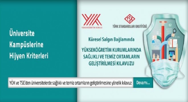 Yükseköğretim Kurulu(YÖK) ve Türk Standartları Enstitüsü (TSE) iş birliğiyle "Küresel Salgın Bağlamında Yükseköğretim Kurumlarında Sağlıklı ve Temiz Ortamların Geliştirilmesi Kılavuzu" hazırlandı.