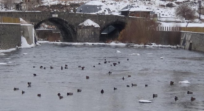 Hava sıcaklığının sıfırın altında 13 derece de seyrettiği kentte, akarsuların büyük bölümünün donmasıyla birlikte yaşam alanları daralan ördekler, besin arayışlarını yerleşim yerlerine kadar taşıdı. Kars Çayı’nın buz tutmayan bölümlerinde görülen ördekler, çevredeki vatandaşların ve objektiflerin ilgi odağı oldu.