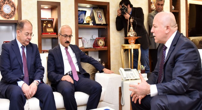 Doğu Anadolu Projesi Bölge Kalkınma İdaresi Başkanlığı yeni binasının açılışı ve bir dizi temasta bulunmak üzere kente gelen Sağlık Bakanı Prof. Dr. Recep Akdağ ile Kalkınma Bakanı Lütfi Elvan, Erzurum Büyükşehir Belediye Başkanı Mehmet Sekmen’i ziyaret etti. Bakanlar Akdağ ve Elvan, Büyükşehir Belediyesi Protokol Defteri’ni imzaladıktan sonra Başkan Sekmen’in makamına geçti. Başkan Sekmen, ziyaretten duyduğu memnuniyeti ifade ederek, Büyükşehir’in yatırım ve projelerini anlattı. Sekmen, “Erzurum’da, Büyükşehir Belediyesi olarak başta altyapı olmak üzere büyük bir kalkınma hamlesini yürütüyoruz. Hem il merkezimizde hem de ilçelerimizdeki 500 noktada aynı anda yapılan bu çalışmalarla ilimizin problemlerini en asgari seviyeye çekerek rüya şehir Erzurum’u inşa ve ihya ediyoruz. Şehrimizde medeniyet tasavvuru ve tarihi dokuyu korumaya yönelik kentsel dönüşüm çalışmalarımız hızla devam ediyor. İktisadi, sosyal ve kültürel alanlarda yapılan değişim ve dönüşümü Erzurum bütün hücrelerinde hissediyor. Kalkınma Bakanlığımızın da desteklediği Kültür Yolu Projesi’nin ikinci etabı sürüyor. Erzurum, bölgesinde her alanda gelişmiş bir kent olma hüviyetine emin adımlarla ilerliyor” diye konuştu. Büyükşehir Belediyesi Genel Sekreter Yardımcısı Selami Keskin de, Kültür Yolu Projesi ile ilgili kentte yapılan çalışmaları anlattı. Keskin, Cazibe Merkezlerini Destekleme Programı kapsamında çalışmaların gerçekleştiği alanın 6 bin yıldır şehrin merkezi olduğunu ifade etti. Kültür Yolu Projesi’nde ciddi adımların atıldığını kaydeden Keskin, projede şimdiye kadar hayata geçirilen yatırımlarla ilgili Bakanlara brifing verdi. Bu arada Kalkınma Bakanı Elvan, yatırım bütçesi kullanımında Türkiye birincisi olan Erzurum Büyükşehir Belediye Başkanı Mehmet Sekmen’i tebrik ederek, başarılarının devamını diledi.