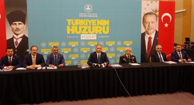Bir dizi ziyaret için Yozgat’a gelen İçişleri Bakanı Ali Yerlikaya, Yozgat Cemil Çiçek Personel Eğitim Merkezi’nde düzenlenen Güvenlik Toplantısı'na katıldı. Toplantının ardından basın mensuplarına açıklamalarda bulunan Yerlikaya, Türkiye Yüzyılı'nın huzurun yüzyılı olacağını söyleyerek, “Bu cumhurbaşkanımızın sözü ve bizim huzurun yüzyılı ile ilgili, huzurla ilgili kara vatandan mavi vatana ve siper vatana İçişleri Bakanlığının temel görevi huzur, güvenlik ve esenlik olduğu bilinciyle gece gündüz demeden bakanlık merkez ve taşra teşkilatımızla 600 bini aşkın ailemizle beraber cansiparane bir şekilde çalışıyoruz ve çalışmaya da devam edeceğiz” dedi.