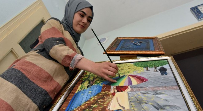 İlk yaptığı yağlı boya resminin “mavi kapı” olduğunu anlatan Bayram, resmin çok zor olduğunu, zaman zaman da pes etme noktasına geldiğini belirterek, tüm yaşadıklarına rağmen pes etmediğini söyledi. Bayram, süreci şöyle anlattı: “Kursta 50 yaş üzeri emekli olmuş, hobi amaçlı ilgilenen insanlar vardı. Çok zor oldu ilk aşamada seçtiğim resim. Pes etmedim, yapabilirim dedim. Bazen çok hayat kırıklığına uğradım, yapamadığım yerler oldu. Kalemle çizdikten sonra hocam mavinin içindeki yeşili sorup durdu. Ağlamak üzereydim. Çok hırslandım. Zamanla yapmaya başladım. Arkadaşlarım bu süreçte çok motive etti beni ve sürekli ‘sen yaparsın’ dediler. Yaptıkça bir şeyler çıktı ve beğenmeye başladım. Böyle olunca da yapabileceğime inandım. Zamanla eksiklerimi tamamlıyorum. Bir aydan fazla bir sürede bu mavi kapı resmini yaptım.”