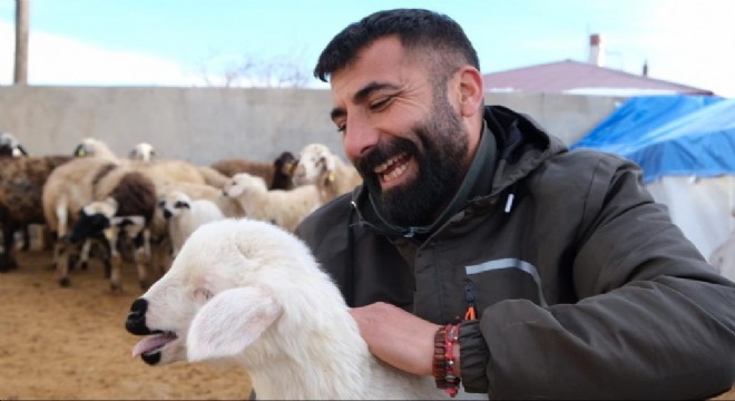 Başpınar Mahallesi'nde hayvancılık yapan üreticilerden İbrahim Erel, yeni doğan kuzularını kucağına almanın mutluluğunu kaydetti.