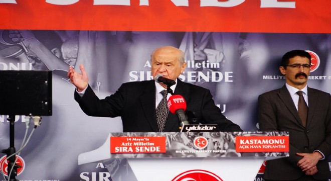 14 Mayıs seçimlerinde hizmetlerin kesintiye uğratılmaması gerektiğini kaydeden Bahçeli, “Cumhur İttifakı’nın özü sağlamdır, sözü senettir, duruşu yerli ve millidir. Biz başkalarına benzemeyiz, başkaları gibi yerimizde saymayız, boşa sallayıp dolu tutmanın peşinden hiç koşmayız. Yaptık mı adam gibi yapar, millerimiz ne söylerse onu söyler, onu savunuruz. Çünkü, tarafımız Türkiye’dir, tarafımız mazlum gönüllerdir. Geçtiğimiz Cumartesi günü inşası projelendirilen 143 bin köy evinden bir kısmının tamamlanmasına Sayın Cumhurbaşkanımız ile birlikte memnuniyet ile şahit olduk. Gaziantep’in Nurdağı ilçesinde yapımı biten köy evlerinin teslim töreninde umut dolu geleceğimizin aydınlığını gördük. Sözümüz sözdür, hiçbir insanımızı açıkta bırakmayacağız. Bugüne kadar her vaadimizi yaptığımız gibi, her sözümüzü tuttuk. Hiçbir insanımıza sırt çevirmedik, bundan sonra da çevirmeyeceğiz. Türkiye’nin önü açıktır, istikbal Türk milletinindir. 14 Mayıs’tan sonra eser ve hizmet siyaseti kesintiye uğramamalıdır. Ülkemiz bir yol kazasına mahkum olmamalıdır. Yazılan dış menşeyli karanlık senaryoda figüranlığa talip olan zillet partilerine Kastamonu’dan çığ gibi bir tepki gelmelidir. Şu sorularıma okkalı bir cevap veriniz. Sel ve su taşkınlarını istismar edenleri, 14 Mayıs’ta şaşkına çevirecek misiniz, depremden siyasi rant düşü kuranlara haddini bildirecek misiniz, ‘nerede bu devlet’ diye maksadi ve marazi soru soranlara dünyanın kaç bucak olduğunu öğretecek misiniz” diye konuştu.
